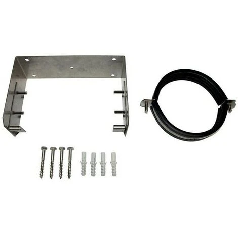 verstellbarer Baustaz zur Befestigung der Abgasleitung an der Außenwand, bestehend aus: Halteschelle Ø125 mit Gummieinlage, Konsolenblech mit einstellbarer Führung – Wandabstand zur Rohrmitte ca. 115-150 mm, Befestigungsmaterial Edelstahlschrauben und Dübel Empfohlener Abstand der verstellbaren Wandkonsolen ca. 2 m