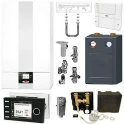Die Gas-Brennwerttherme wird mit eingebautem Bedienmodul BM-2 geliefert, optional ist sie aber auch als externe Fernbedienung im Wandsockel einsetzbar (Wandsockel als Zubehör erhältlich). Eine Ansteuerung via Smartphone ist ebenfalls möglich (Schnittstellenmodul ISM7i erforderlich).