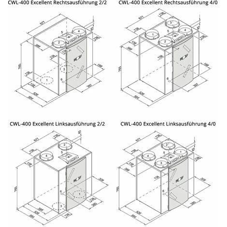 - Erhältlich auch als CWL-180 Excellent mit 180m³/h und CWL-300 Excellent mit 300m³/h Luftleistung.