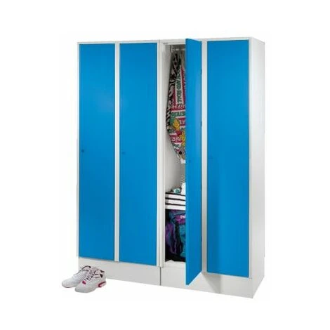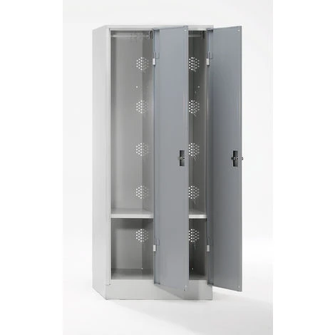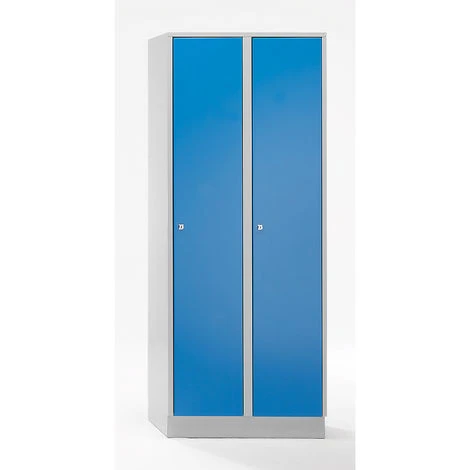 Abteilbreite: 350 mm, Anzahl Abteile: 2, Breite: 700 mm, Fachbreite: 300 mm, Fachhöhe: 1245 mm, Höhe: 1800 mm, Innenbreite: 348 mm, Sockelhöhe: 100 mm, Staffelpreisvorteil ab: 1 Stück, Tastaturplatte: 0, Tiefe: 500 mm, Anlieferung: montiert, Ausführung Spindgestell: mit Bodensockel, Korpusfarbe: lichtgrau, Material: Stahlblech, einbrennlackiert, Preiseinheit: Stück, Türart: Doppelwand-Türen, Türfarbe: lichtblau RAL 5012, Verschlussart: Doppelbartschloss mit 2 Schlüsseln