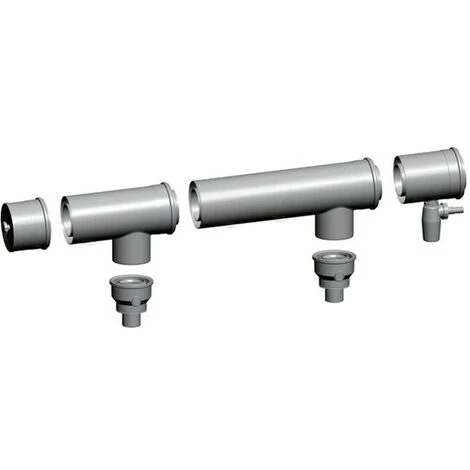 weiß, steckbar, raumluftunabhängig, bestehend aus: 2x Erweiterungen DN 60/100 auf Muffe DN 80/125, 2x Erweiterungen DN 80/125 auf Muffe DN 110/160, 2x Sammler DN 110/110/160, Luft-/Abgasrohr DN 110/160 mit Kondensatablauf, Endstück DN 110/160 mit Revisionsöffnung, Siphon für Kondensatablauf, Gleitmittel-Tube 50 ml