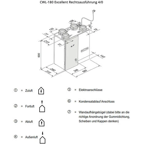 - Erhältlich auch als CWL-300 Excellent mit 300m³/h und CWL-400 Excellent mit 400m³/h Luftleistung.
