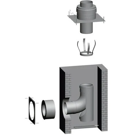 raumluftunabhängig, C33x, C53, raumluftabgängig, B23, bestehend aus: Schachtabdeckung DN 160 (Edelstahl) mit Mündungsrohr (Polypropylen schwarz), Abstandshalter DN 160, Stützbogen 87° DN 160 (Polypropylen) mit Abstützung, Wandfutter DN 160/225 (Edelstahl), Mauerblende DN 225 (Edelstahl), Gleitmittel-Tube 50 ml