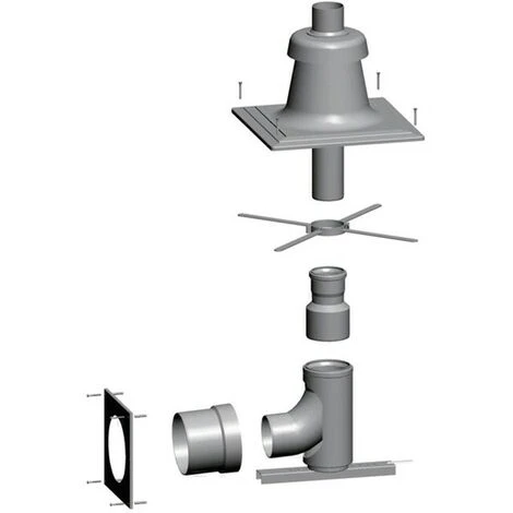raumluftunabhängig, bestehend aus: Schachtabdeckung DN 80 (Polypropylen) mit Mündungsrohr (Polypropylen schwarz), 6x Abstandhalter DN 80 (Polypropylen), Reduzierung DN 110 auf Muffe DN 80 (Polypropylen), Stützbogen 87° DN 110 (Polypropylen) mit Abstützung, Wandfutter DN 110/160 (Edelstahl), Mauerblende DN 160 (Edelstahl), Gleitmittel-Tube 50 ml