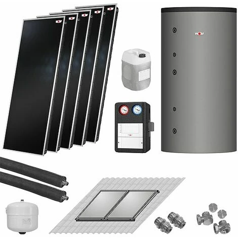 Wolf Thermische Solaranlage (Bruttoabsorberfläche 11,5 m²) mit 5 Stück Hochleistungs-Sonnenkollektoren F3-1 und Pufferspeicher BSH-800, bestehend aus: