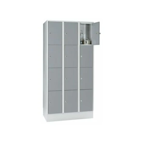 Abteilbreite: 300 mm, Anzahl Fächer: 12, Breite: 900 mm, Fachbodenhöhe: 410 mm, Fachbreite: 300 mm, Höhe: 1800 mm, Sockelhöhe: 100 mm, Staffelpreisvorteil ab: 1 Stück, Tastaturplatte: 0, Tiefe: 500 mm, Innenausstattung: Fächer ohne Unterteilung, Korpusfarbe: lichtgrau, Material: Stahlblech geschweisst, Türart: Vollwand-Türen, Verschlussart: Doppelbartschloss mit 2 Schlüsseln