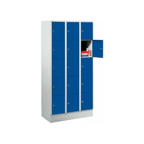 Abteilbreite: 300 mm, Anzahl Abteile: 15, Breite: 900 mm, Fachbodenhöhe: 320 mm, Fachbreite: 300 mm, Höhe: 1850 mm, Sockelhöhe: 100 mm, Staffelpreisvorteil ab: 1 Stück, Tastaturplatte: 0, Tiefe: 500 mm, Ausführung Spindgestell: mit Bodensockel, Innenausstattung: ohne Ausstattung, Korpusfarbe: lichtgrau, Material: Stahlblech, punktgeschweißt, Preiseinheit: Stück, Türart: Vollwand-Türen, Türfarbe: enzianblau RAL 5010, Verschlussart: Sicherheitszylinderschloss mit 2 Schlüsseln