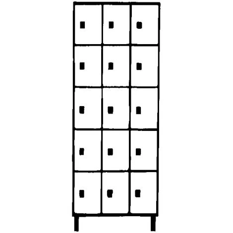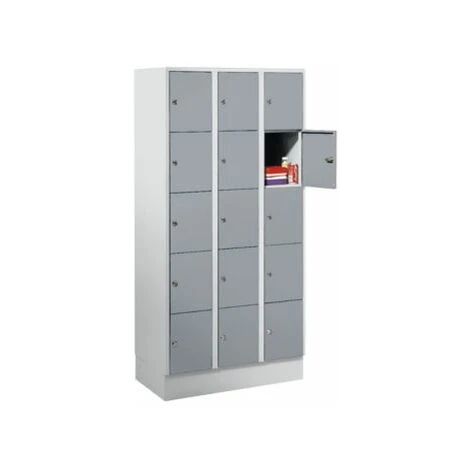 Abteilbreite: 300 mm, Anzahl Fächer: 15, Breite: 900 mm, Fachbodenhöhe: 320 mm, Fachbreite: 300 mm, Höhe: 1800 mm, Sockelhöhe: 100 mm, Staffelpreisvorteil ab: 1 Stück, Tastaturplatte: 0, Tiefe: 500 mm, Innenausstattung: Fächer ohne Unterteilung, Korpusfarbe: lichtgrau, Material: Stahlblech geschweisst, Türart: Vollwand-Türen, Verschlussart: Doppelbartschloss mit 2 Schlüsseln