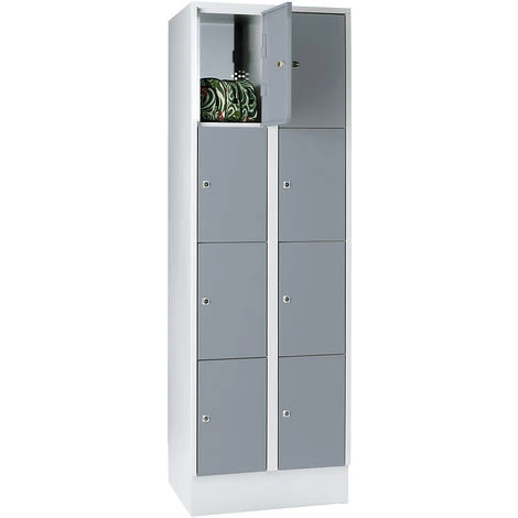 Abteilbreite: 300 mm, Anzahl Fächer: 8, Anzahl Schlüssel: 8, Breite: 600 mm, Fachbodenhöhe: 410 mm, Fachbreite: 400 mm, Höhe: 1800 mm, Sockelhöhe: 100 mm, Staffelpreisvorteil ab: 1 Stück, Tastaturplatte: 0, Tiefe: 500 mm, Innenausstattung: Fächer ohne Unterteilung, Korpusfarbe: lichtgrau, Material: Stahlblech geschweisst, Türart: Vollwand-Türen, Verschlussart: Doppelbartschloss mit 2 Schlüsseln