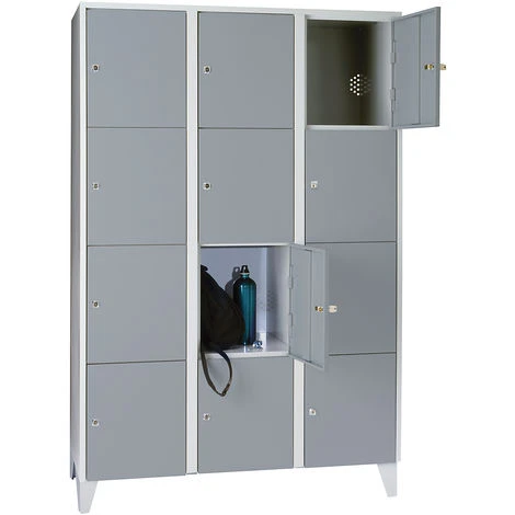 Abteilbreite: 400 mm, Anzahl Fächer: 12, Breite: 1200 mm, Fachbodenhöhe: 410 mm, Fachbreite: 300 mm, Höhe: 1850 mm, Staffelpreisvorteil ab: 1 Stück, Tastaturplatte: 0, Tiefe: 500 mm, Innenausstattung: Fächer ohne Unterteilung, Korpusfarbe: lichtgrau, Material: Stahlblech geschweisst, Türart: Vollwand-Türen, Verschlussart: Doppelbartschloss mit 2 Schlüsseln