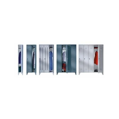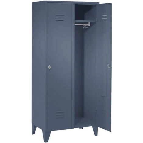 Abteilbreite: 400 mm, Anzahl Abteile: 2, Breite: 800 mm, Fußhöhe: 150 mm, Höhe: 1850 mm, Staffelpreisvorteil ab: 1 Stück, Tastaturplatte: 0, Tiefe: 500 mm, Anlieferung: montiert, Ausführung Spindgestell: mit 4 Stollenfüßen, Innenausstattung: 1 Hutboden, 1 Kleiderstange, 4 Schiebehaken, Korpusfarbe: Lichtblau Ral 5012, Material: Stahlblech, Oberfläche: beschichtet, Preiseinheit: Stück, Türart: Vollwand-Türen, Türfarbe: lichtblau RAL 5012, Verschlussart: Doppelbartschloss mit 2 Schlüsseln