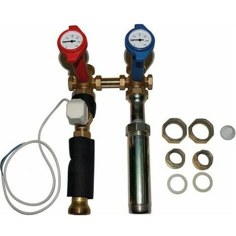 bestehend aus: elektrischem Absperrventil 230 V, stromlos geschlossen, Kugelhähne mit Thermometer in Vor- und Rücklauf, Schwerkraftbremse, 384 x 250 x 260 mm, Anschluss unten flachdichtend 1 1/2″, Anschluss oben lösbare Übergangsverschraubung auf IG 1″ (DN 25), Design-Wärmedämmschalen aus EPP, Gruppe komplett montiert, hydraulisch und elektrisch geprüft, ohne hydraulische Weiche